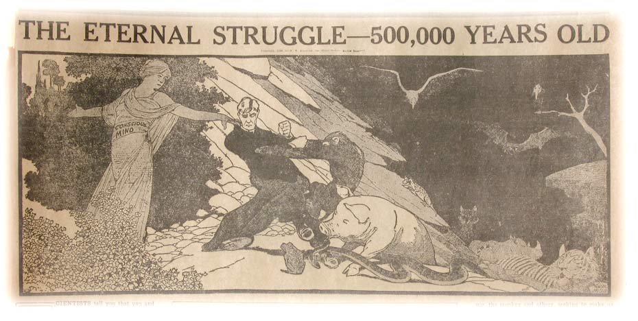 shows you pulling in the other direction. Conscious Mind, the good power that men have slowly built up through five hundred thousand years of life on this earth, pulls gently but steadily in one direction. And the animal forces, the monkey habit of imitation, the serpent, the monkey, all the others, with all their power, cannot in the long run pull man back into the depths from which he has slowly risen. |