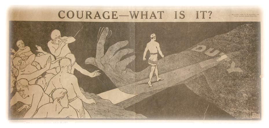 kind–courage to walk straight in the direction of DUTY. With the band playing and crowds applauding, MANY will risk their lives. Is that courage? With no one to applaud and no one to see, a FEW will act as “courageously” as though all the world were watching. That IS real courage. What part does courage play in the life and progress of men? Where should we be without it: what has it achieved in past history: what can it do for us individually? It is one of the great forces that make up the complicated strugglings of human beings. |
