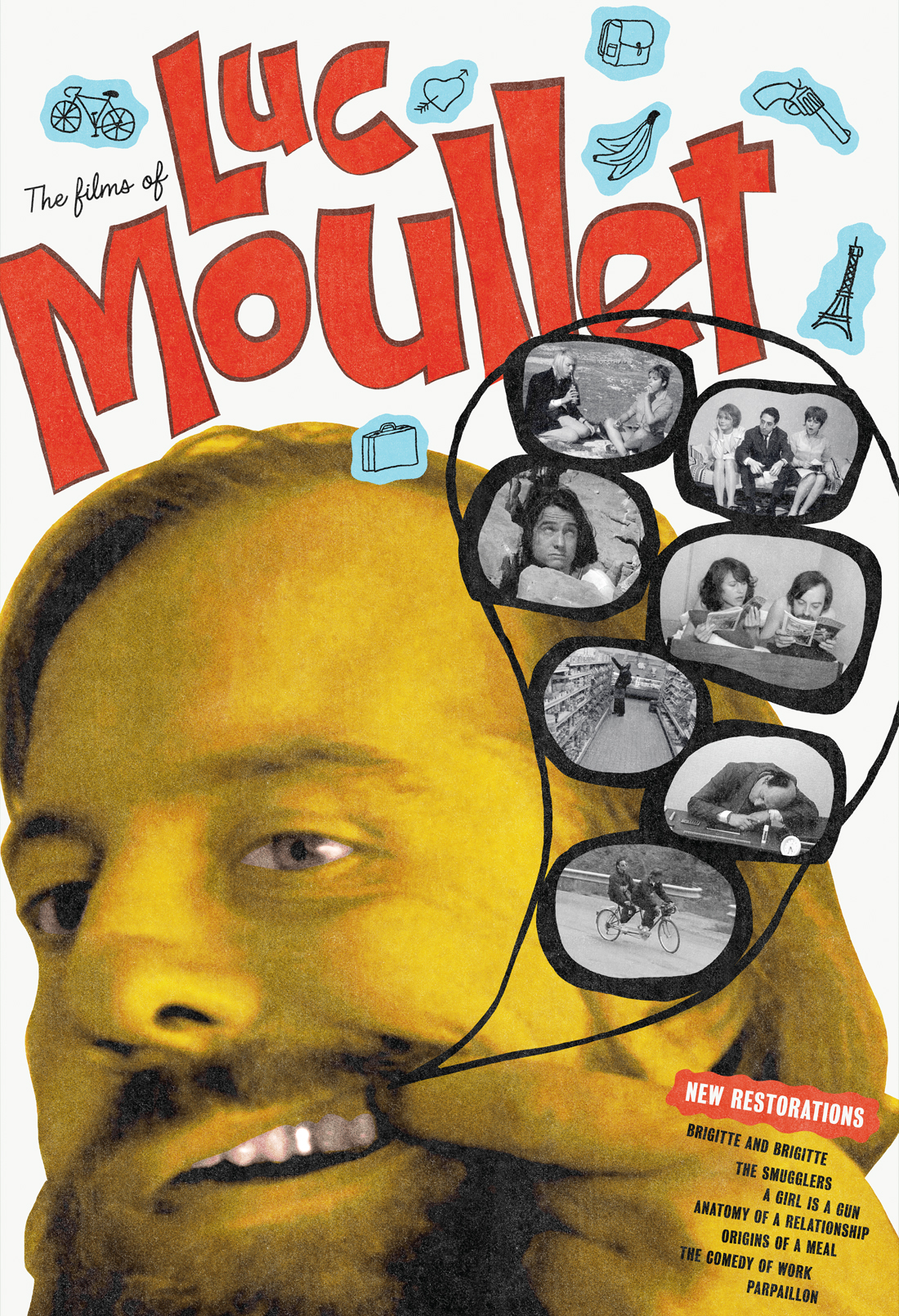 From the client’s initial job description: Dubbed “the prince of shoestring cinema,” Moullet’s films are characterized by their rigorous poverty, their learned amateurism, and—above all—their sense of humor, by turns burlesque and deadpan. His whole aesthetic is irreverent and self-effacing.